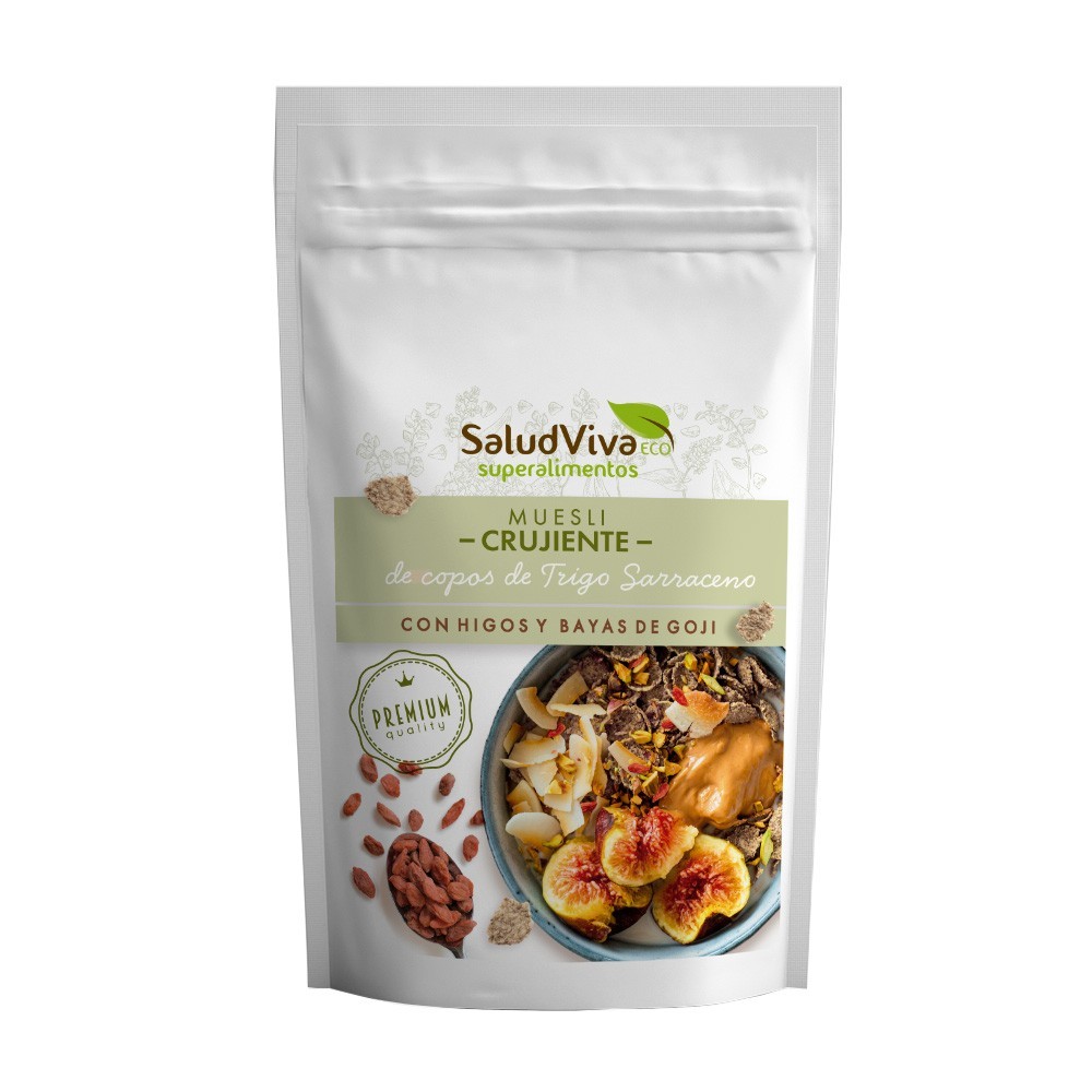 Copos crujientes de trigo sarraceno*, chips de coco crudos*, higos troceados*, dátiles troceados*, ALMENDRAS repeladas*, pasas sultanas.*, bayas de goji* y semillas de lino marron*.